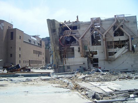 市場の写真で津波の水位がどれほどのものだったのかよくわかります。窓下のラインが引き波の時についた跡(ガレキ等で汚れが強い)だと思われます。ここに限らず市場は大型トラックが出入りするため2階の位置がかなり高く設計されています。「女川町地方卸売市場」震災前は魚介類、特に秋刀魚の水揚げ量は日本有数の市場でした。この市場の目の前がS君の職場でした。